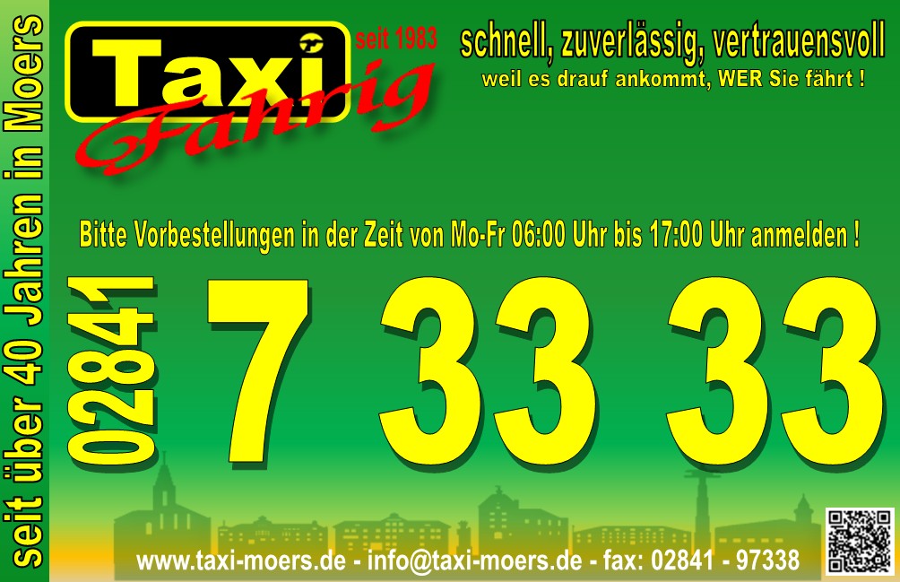 Auf unserer Hauptseite www.taxi-moers.de finden Sie weitere Informationen zu Taxi Moers®, zur Firmengeschichte, zu Fahrzeugen, Bewertungen, Aktionen und mehr Details rund um unseren Betrieb.